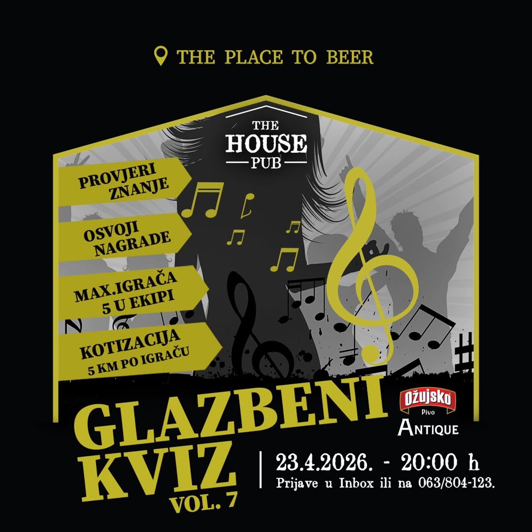 The House Pub u saradnji sa @hofthestage organizuje sedmo izdanje Glazbenog kviza, koje se održava 23.04.2026. u 20:00 h. Kviz obuhvata različite muzičke kategorije i namijenjen je ekipama koje žele testirati znanje o muzici i usput naučiti nešto novo.