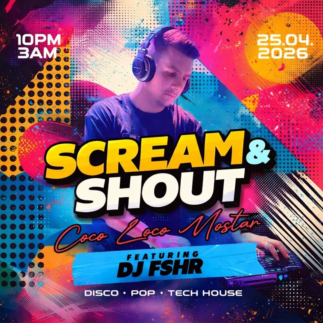 Saturday Party uz DJ FSHR održava se u COCO LOCO Mostar u subotu, 25.04.2026. Start je u 22:00, a zabava traje do 03:00. Očekuje vas klupska noć uz plesnu muziku (disco, pop, tech house, techno i EDM) i party atmosfera u centru Mostara.