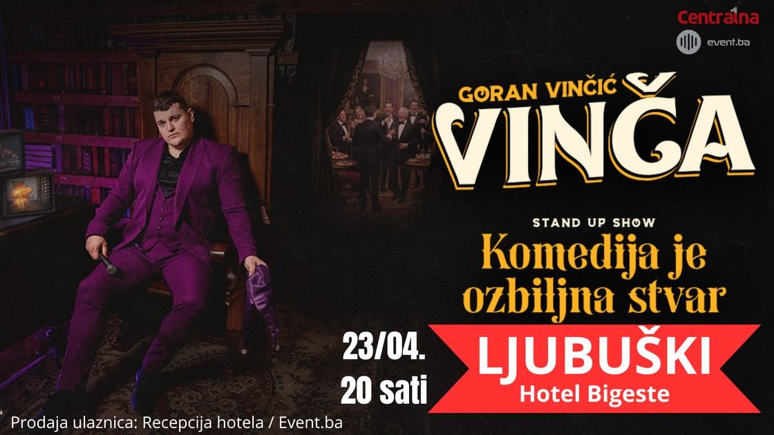 Komedija je ozbiljna stvar: Vinča najavljuje treći samostalni show koji će se održati 23.04.2026. godine u 20 sati u Hotelu Bigeste u Ljubuškom. Ulaznica košta 25 KM, a prodaja ulaznica je dostupna na recepciji hotela i putem Event.ba. Nakon uspješnih predstava ‘Dežurni krivac’ i ‘Reci mi da se šališ’, Goran Vinčić Vinča se vraća s novim materijalom koji se bavi ozbiljnim temama kroz humor. U ovom showu, Vinča se osvrće na savremeni svijet, medijski haos, društvene apsurde i generacijske sukobe, koristeći humor kao sredstvo za otvaranje važnih tema. Njegov novi projekt, inspirisan slikom ‘Stańczyk’, donosi oštriji i iskreniji pristup komediji.